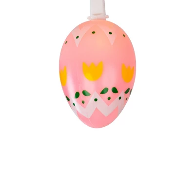 Add some glow to your Easter event with this string of egg-shaped lights. Each light bulb is covered with either a yellow, pink or purple decorated egg-shaped cover. The UL listing allows for these to be used both indoor and outdoor. They’re a fun way to decorate any room, window, buffet or Easter party table with color and light.Product features: Color: clear bulbs / white wire Multi-color egg-shaped light covers Number of bulbs on string: 10 Bulb size: mini Spacing between each bulb: 10″ Lighted length: 7.25′ (approximately)Total length: 9.5′ (approximately)24″ lead cord4″ tail cordAdditional product features:If one bulb burns out, the rest will stay lit Contains end-to-end connectors which allows you to connect multiple sets together (not to exceed 210 watts)Comes with replacement bulbs and spare fuseUL certified and approved for indoor or outdoor useWire gauge: 22120 volts, 60 hertz, 0.08 amps, 9.6 watts Light cover dimensions: 2.5″H x 1.75″WMaterial(s): plastic/wire/glass bulbs
