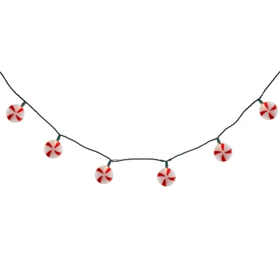 Sweeten up your holiday decor with these festive lights. These lights have peppermint candy covers that create a unique glow to the surrounding area. Perfect for adding some holiday magic to your mantle, trees, garland, or for lending some sparkle to your covered patio.Product Features:Peppermiint candy novelty lightsColor: clear bulbs / green wireNumber of bulbs on string: 10Bulb size: miniBulb type: incandescentSpacing between bulbs: 8″Lighted length: 6’total length: 8.5’24” lead cord4″ tail cordAdditional Product Features:Steady burning bulbsIf one bulb burns out, the rest will stay litContains end-to-end connectors which allows you to connect multiple sets of lights together (not to exceed 210 watts)UL certified and approved for indoor or outdoor useComes with replacement bulbs and spare fuseWire gauge: 22120 volts, 60 hertz, .08 amps, 9.6 wattsMaterial(s): glass bulbs/plastic light covers/wire