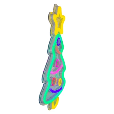 Brighten up your home decor with this delightful neon wall sign This classic green holiday tree comes ready for hanging with keyhole hooks at the top and can be hung on a wall or used a window sign. Perfect as a night light or wall decor.Product Features:Features holiday tree silhouetteColor: green bulbs / white wireLED bulb type: SMD 2835Approximate thickness: 8mm Approximate width: 11mm6.75′ lead cordDouble-sided designComes ready-to-hang with two keyhole hooks at the topAdditional Product Features: LED lights use up to 80% less energy Super bright Bulbs stay cool to the touchUL certified and approved for indoor onlyCannot be connected together with other lighted itemsSuction cups and hanging hardware not includedPowered by the included 5V USB cordDoes not include USB power adapter Dimensions: 15″H x 8″W x 1″D Material(s): plastic/silicone/wire/metal