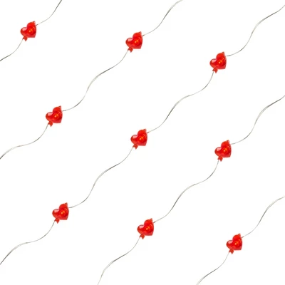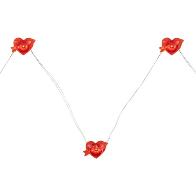 Set hearts aglow this Valentine’s Day with our heart-shaped fairy lights. The red faceted hearts each house one warm white micro LED light. The facets allow the light to reflect beautifully, providing a warm cozy glow. The versatile silver-colored copper wire is durable and highly flexible, allowing you to bend and shape the lights quickly and easily for all your decorating needs.Product features:Color: warm white bulbs / silver copper wireRed heart and arrow light coversNumber of bulbs on string: 20Bulb size: micro fairyBulb type: LEDSpacing between each bulb: 4″Lighted length: 6.25’Total length: 7.5’15” lead cordAdditional product features:LED lights use 90% less energyBulbs stay cool to the touchFor indoor use onlyRequires (3) ‘AA’ size batteries – not includedConvenient on/off switch on the battery packNon-replaceable bulbsCannot connect multiple sets togetherHeart dimensions: 0.5″H x 0.85″WMaterial(s): plastic/wire