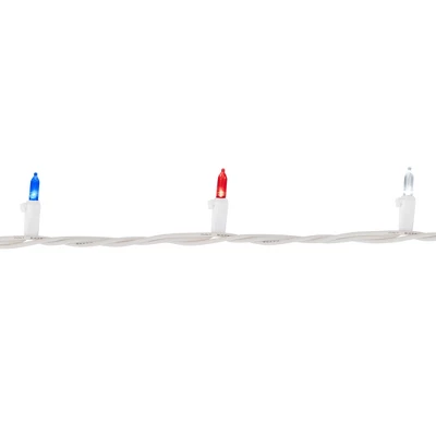 Deck your halls in patriotic style with our LED mini holiday light set in red, white, and blue. Perfect for celebrating not only the holiday season but also Memorial Day, the Fourth of July, and Labor Day with a burst of vibrant color. These versatile lights bring a festive touch to any occasion, whether you’re trimming the tree or adding flair to your outdoor decor. With energy-efficient LED bulbs and a durable design, they’re sure to brighten up your celebrations for years to come.Product Features:Color: red, pure white and blue bulbs / white wire Number of bulbs on string: 100 Bulb size: miniBulb type: LED Spacing between each bulb: 4″ Approximate lighted length: 32.75’Total length: 34′ 12″ lead cord3″ tail cordAdditional Product Features: LED lights use 90% less energyDurable non-glass replaceable bulbsCool to the touchIf one bulb burns out, the rest will stay lit Lights are equipped with the Lamp Lock feature, which makes them replaceable, interchangeable and keeps them from falling outUL certified and approved for indoor or outdoor useComes with replacement bulbs and spare fuse Contains end-to-end connectors which allow you to connect multiple sets together (not to exceed 210 watts)Wire gauge: 22120 volts, 60 hertz, .04 amps, 4.8 wattsMaterial(s): plastic/glass bulbs/wire