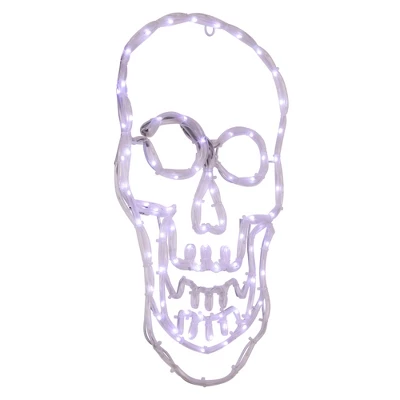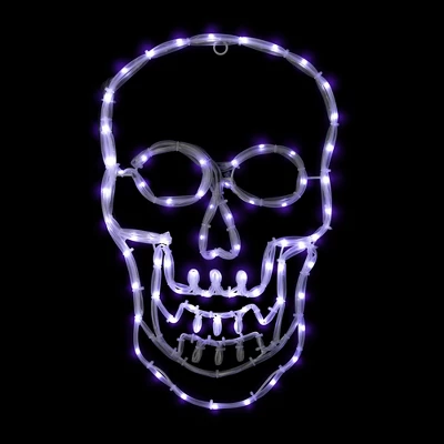 Anchor a chilling focal point in your haunted house with this LED four function skull Halloween window decoration, a bold decoration designed to capture attention. This glowing skull silhouette is pre-lit with brilliant pure white micro lights, producing a crisp and ghostly glow that radiates through your window for maximum visibility. Perfect for greeting trick-or-treaters or impressing Halloween party guests, this striking Halloween decoration ensures your home stands out during the spooky season. With customizable settings, you can adjust the atmosphere of your Halloween display to match any mood—whether you want a chilling steady shine or an animated light show. Crafted with durable materials, this LED Halloween skull decoration is simple to set up and secure in windows. This window silhouette pairs beautifully with other lighted decorations such as pumpkins, bats, or skeletons, creating a cohesive haunted house look. Ideal for homes, apartments, or businesses, it transforms any window into a spooky spectacle. Whether you’re hosting a Halloween gathering or just delighting neighborhood visitors, this decoration is sure to impress. With its crisp illumination, versatile lighting effects, and bold skull design, the LED 4 function skull Halloween window decoration is the ultimate glowing accent to elevate your Halloween decor.Product Features:Tube color: clearNumber of bulbs: 156Bulb color: pure whiteBulb size: micro fairyBulb type: LED50” black lead cordAdditional Product Features:UL certified and approved for indoor useLED lights use 90% less energy Bulbs stay cool to the touchDurable non-replaceable plastic bulbsWhite frame One-sided designIncludes a metal loop for hanging If one bulb burns out, the rest will stay lit Contains 1 AC adaptor plug with 4 function control boxPush button function controlFunctions include: 2 types of steady, flashing and slow fadeWire gauge: 24Input: 120 volts, 60 hertz, .11 ampsOutput: 3.5 volts, 0.9 ampsDimensions: 18”H x 11”W x .5″DMaterial(s): plastic/wire/metalNote:Not all bulbs will be lighted for each function