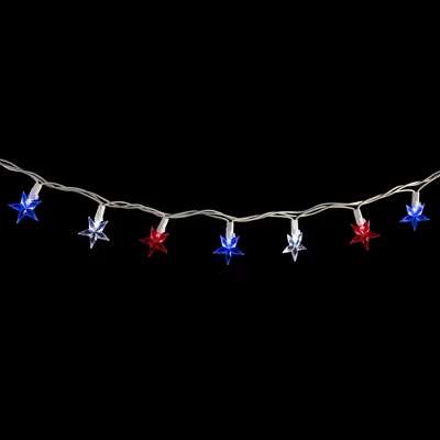 Illuminate your patriotic celebrations with these red, white and blue star-shaped LED string lights. This set creates a vibrant display for Fourth of July, Memorial Day, and other patriotic occasions. String these lights along fences, porches, or indoor spaces this Independence Day to generate a celebratory atmosphere. These string lights provide a simple way to display your national pride on the 4th of July. Product features:Color: red, pure white and blue bulbs / white wire Red, white and blue star-shaped light coversNumber of bulbs on string: 30Bulb size: concave wide angle nub (mini bulb)Spacing between each bulb: 3″ Lighted length: 7.25’Total length: 9.25′ 24″ lead cord5″ tail cordAdditional product features:LED lights use 90% less energy Super bright bulbs Durable non-glass replaceable bulbs Cool to the touch Lights are equipped with Lamp Lock feature, which makes them replaceable, interchangeable and keeps them from falling outIf one bulb burns out, the rest will stay lit Contains end-to-end connectors which allows you to connect multiple lighted items together (not to exceed 210 watts)Wire gauge: 22 Comes with replacement bulbs and spare fuseUL certified and approved for indoor or outdoor use120 volts, 60 hertz, .027 amps, 3.2 wattsLight cover dimensions: 1.5″ high x 1.62″ wideMaterial(s): acrylic/plastic/wire