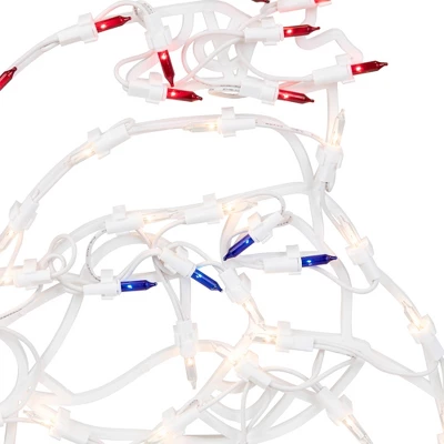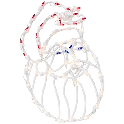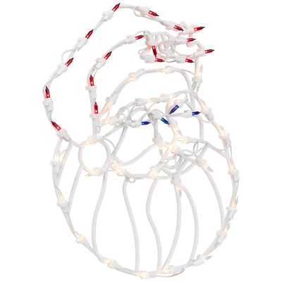 Light up your home this holiday season with this Santa window silhouette. The one-piece construction makes it an easy way to add a festive touch to your decor. Designed for windows, but also great for walls, doors, and mantles.Product Features:Color: red, white and blue bulbs / white wireNumber of bulbs: 50Bulb size: mini24″ white lead cordDouble-sided design Additional Product Features:Super bright bulbsUL listed and approved for indoor useIf one bulb burns out, the rest will stay lit Comes with replacement bulbs and spare fusesContains 1 plug with end connector which allows you to stack multiple lighted items together (not to exceed 210 watts)Suction cup includedWire gauge: 22120 volts, 60 hertz, .17 amps, 20.4 wattsDimensions: 18″H x 16″W x 0.25″DMaterial(s): plastic/wire/glass bulbs