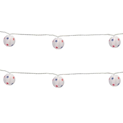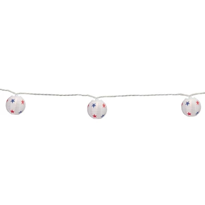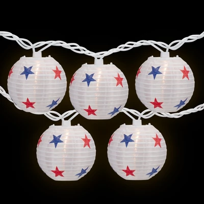 Add a touch of classic Americana charm to your outdoor space with these paper lantern patio lights. Each lantern features a pristine white hue adorned with timeless star designs in vibrant red and blue, reminiscent of patriotic celebrations and summer evenings under the stars. Illuminate your patio or garden with these whimsical lights, creating a warm and inviting atmosphere for gatherings with family and friends. Whether you’re hosting a Fourth of July barbecue or simply enjoying a quiet evening outdoors, these paper lantern lights will effortlessly evoke a sense of nostalgia and patriotism.Product Features:Bulb color: clear bulbs / white wireBulb size: miniBulb type: incandescentNumber of bulbs on string: 10Spacing between each bulb: 12″Lighted length: 8.5’Total length: 11’6″ tail cord24″ lead cordAdditional Product Features:If one bulb burns out, the rest will stay litContains end-to-end connectors which allows you to connect multiple sets of lights together (not to exceed 210 watts)UL certified and approved for indoor or outdoor useComes with replacement bulbs and spare fuseWire gauge: 22120 volts, 60 hertz, .06 amps, 7.2 wattsLantern Dimensions: 3″ high x 3″ diameterMaterial(s): paper/plastic/glass bulbs/wire
